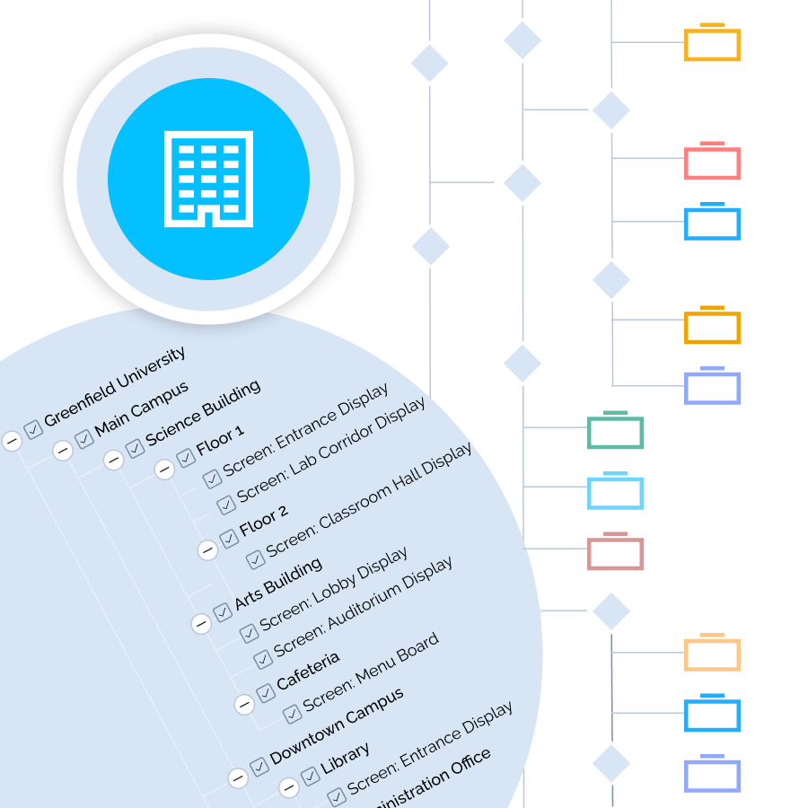 Empower your organization with a flexible mapping hierarchy on the placement of screens whichever way you want. Our system provides freedom to map any complex organization structure catering to any business you run.